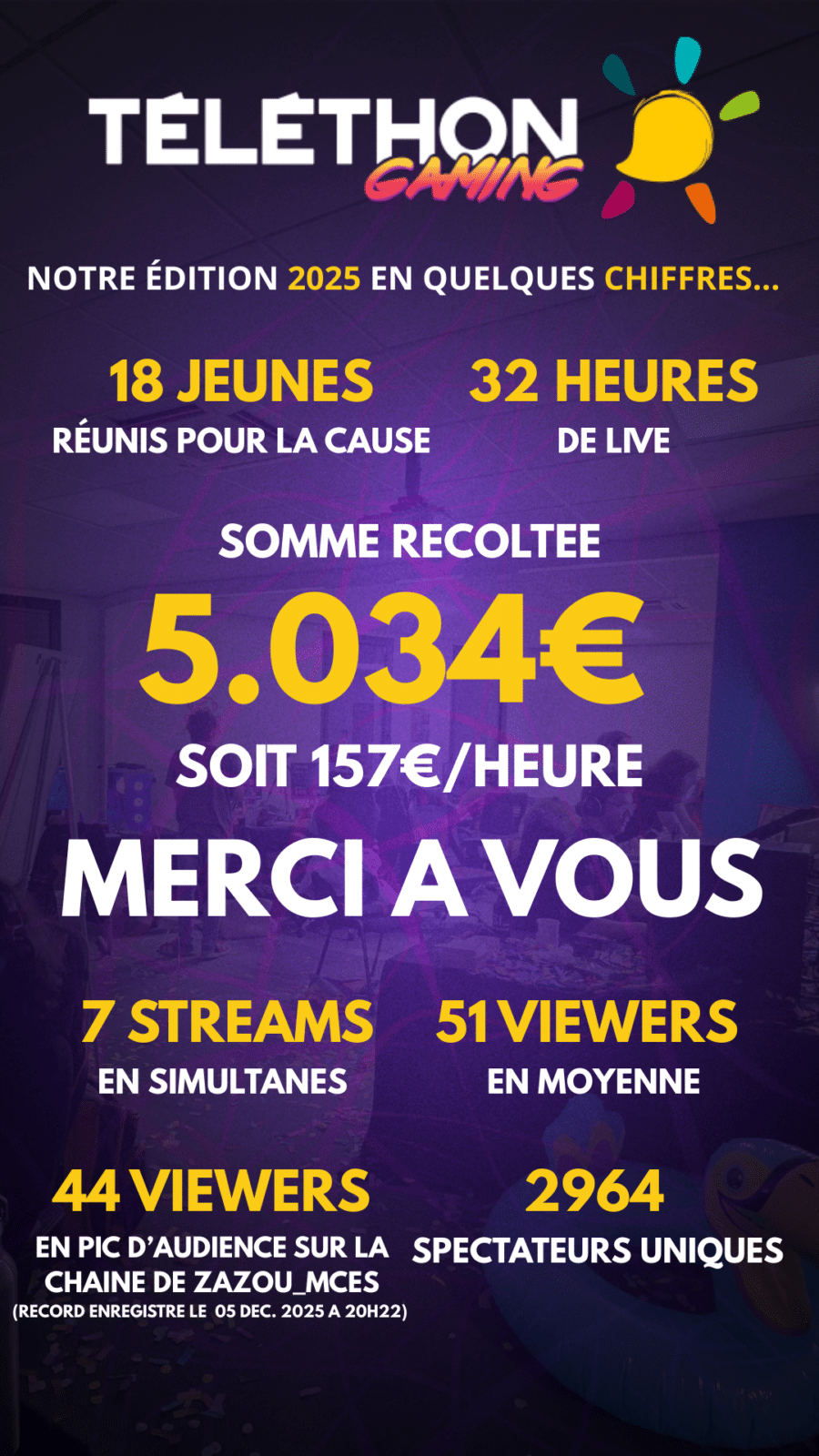 Grâce à leur énergie et à l’implication du public, le Téléthon Gaming 2025 a permis de collecter 5 034 € au profit de l’AFM-Téléthon. Au-delà du montant collecté, c’est l’enthousiasme des bénévoles qui ont marqué cette première édition. Pour beaucoup, c’était une première expérience de coordination, d’animation ou de gestion d’un live à grande échelle… et ils ont relevé le défi !
